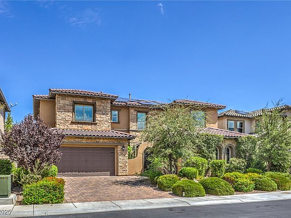 Introducing a refined residence in an exclusive gated community in Summerlin, this Toll Brothers home offers four bedrooms and four-and-a-half bathrooms across 4,206 square feet of beautifully curated living space. The private downstairs bedroom with ensuite provides versatility for guests or multi-generational living, while the upstairs primary suite delivers elevated comfort with a spa-style bath, custom dual closets, and access to a covered balcony showcasing sweeping views of the Las Vegas Strip and mountains. Entertain with ease in the gourmet kitchen featuring Jenn-Air and Sub-Zero appliances, a quartz waterfall island, custom backsplash, and plenty of cabinetry. The outdoor living space features an “Endless” pool and spa, equipped with an outdoor kitchen and an extended covered patio with a fireplace. With owned solar panels and a Tesla Powerwall 2.0, energy efficiency comes standard. Epoxy-floor in the 3 car garage and a generous loft.