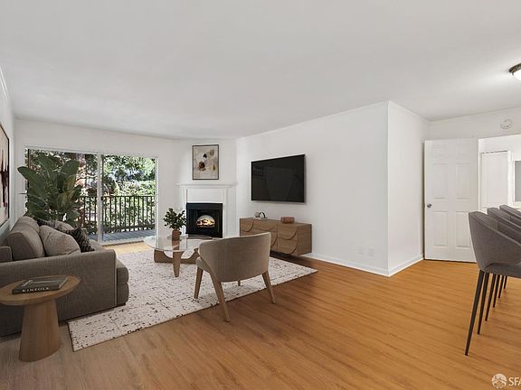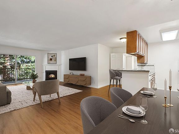 Welcome to this beautifully refreshed and spacious 2-bedroom, 2-bath condo that perfectly combines comfort, privacy, and convenience. The inviting open-concept living and dining area features new flooring, fresh paint, and a cozy gas fireplace that creates the perfect setting for relaxing or entertaining. Both bedrooms are generously sized and positioned on opposite sides of the home, each offering a private en suite full bath and abundant closet space for the ideal blend of comfort and flexibility. Perfect for guests, family, or a home office. Step out onto the large deck surrounded by lush, mature trees, offering a peaceful and private backdrop with serene green views from every window. This move-in-ready home also includes one-car parking and an abundance of guest parking, along with easy freeway access for convenient commuting. This inviting condo delivers a perfect balance of space, function, and natural beauty in a wonderfully central location. This well maintained/manicured condo complex is a must see!