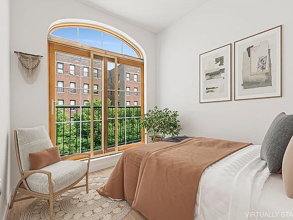 Flowing seamlessly from the kitchen, the spacious living room area is bathed in natural light thanks to the stunning arched, floor-to-ceiling windows. These windows not only enhance the open, airy feel of the space but also provide breathtaking views of the vibrant city skyline. The beautiful hardwood floors add warmth and sophistication, creating the perfect setting for relaxing or hosting guests. This living space is a true sanctuary in the heart of Brooklyn.