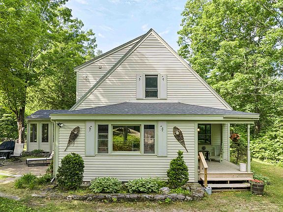 Nestled on over 5 acres in a tranquil, private setting, this charming country cape with a detached barn is located just down the street from the picturesque village of Eaton, NH and minutes to North Conway! The entrance features an inviting open farmer's porch that leads into a spacious mudroom, perfect for storing your outdoor gear. Inside, you'll find an open kitchen and sitting area, highlighted by a stunning Rumford fireplace that flows into a bright and spacious dining room. Just off the kitchen and sitting area is a spectacular three-season porch, characterized by warm wood interiors and an abundance of windows that provide natural light and refreshing summer breezes. The second level includes three bedrooms and two baths, including a primary suite with a whirlpool tub, tiled walk-in shower, built-in drawers, and ample closet space.The detached barn boasts a 22 x 32 finished area with a 3/4 bath and kitchenette, ideal for a quiet home office. An additional room offers potential for further customization. The main level of this remarkable building includes a single bay and a 3-bay 38 x 30 area perfect for boat or camper storage, complete with a 13 ft overhead door and mechanical room. There is also the potential to add an ADU on the property should you wish to pursue an additional structure. The perfect primary residence or vacation getaway!