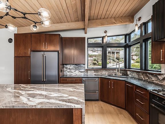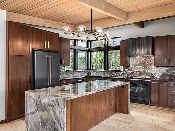 Welcome to this amazing, completely rebuilt home with amazing views. situated on a beautifully landscaped lot in South Eugene. Enjoy the picturesque views of Spencer Butte, trees and sunsets. With just under 2700 square feet this fully redone home is full of quality amenities and options for multiple living situations. The main level in this home is open concept which includes living, kitchen and dining areas, surrounded by views and high ceilings. The Kitchen is nicely appointed and updated with stainless GE Cafe' Refrigerator, Stainless GE Cafe' double drawer dishwasher, 36 inch dual fuel gas range with electric oven and commercial style vent hood with custom fabricated steel surround. The large island has a water style, natural stone countertop and a Zline microwave drawer. A bright and light living area connects to the kitchen and includes two doors to the upper deck. The primary bedroom is also located on the main level with a large walk in closet featuring a space for a stackable washer and dryer. The lovely primary suite bath is includes a soaking tub with a view, and a walk in shower. The main level features engineered wire brushed oak floors. Three additional bedrooms and a large bathroom are on the lower level. The bedrooms boast extra closet space, new wool carpets and high ceilings. The large recreation/ family room is light and bright with lots of windows, Engineered wire brushed oak floors and opens to the lower covered patio. A large laundry room that homeowners dream of is on the lower level and includes custom built walnut cabinets. All new interior paint/trim as well as exterior paint/trim. New siding. New plumbing, electric. Two new, fully ducted heat pumps add extra comfort. Instant hot water heater. Shop area in garage with rubber tiled floor. Amazingly landscaped yard with concrete poured stairs and pavers. Too many quality updates. This is a must see.
