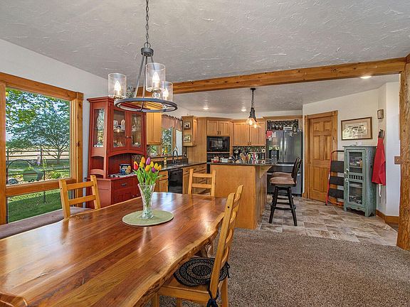 and more. This is a beautiful, just over 8 acre piece of property with an artisan well. 13 Mature black walnut trees, tons of privacy, a 66x44 pole building/barn (current use is storage only) with power, water, raised hay storage, tack/feed room, 3 horse stalls and over 1800 sq ft of concrete. Take advantage of a side income opportunity offering storage indoor or out with 3 available attached lean-tos. There is an outdoor wood burner that could be used to heat the house. As you walk through the front door, you may feel like you're walking into a mini-Yellow Stone