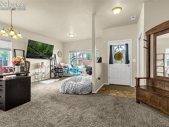 Rare Ranch-Style Home with Zero Steps in Cuchares Ranch! Welcome to this hard-to-find and true main level living home ideally located in the desirable Cuchares Ranch subdivision. Conveniently situated near military bases, Colorado Springs Airport, pocket parks, trails, Bluestem Prairie Open Space, King Soopers Marketplace, and just minutes from the Powers Corridor, offering abundant shopping, dining, and entertainment options. Guests are welcomed by a spacious covered front porch and low-maintenance yard with wifi enabled sprinkler system. Step inside to a bright, open-concept floor plan featuring 9' ceilings, neutral color tones throughout, and expansive windows that flood the home with natural light. The large living/dining area provides flexible space for entertaining, relaxing, or setting up a home office. A stylish barn door adds charm and allows for privacy when desired. Beyond the barn door, you’ll find a generous kitchen equipped with newer Samsung Bespoke smart-appliances; Fridge, Oven, Dishwasher, Microwave Oven, a new single-basin sink, shaker-style cabinetry, smooth countertops, a large pantry, and a center island with bar seating, ideal for casual meals and gatherings. The adjoining oversized walk-out family room opens to a level, fenced backyard with plenty of space for a garden or outdoor living. Back inside, two secondary bedrooms each feature walk-in closets and share a full hallway bath. The secluded primary suite offers a luxurious 5-piece bathroom complete with a soaking tub with tile surround, separate walk-in shower, dual sinks with smooth-surface counters, abundant storage, and a spacious walk-in closet. A separate laundry room with washer/dryer connects to the 2-car garage, which includes pegboards to keep tools and miscellaneous items neatly organized. Additional features include central A/C (installed in 2022), a whole-house water softener, ceiling fans, fresh interior paint, and waiting for your personal touches.