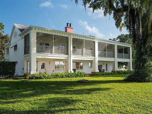 Located on 442+ acres, this remarkable property graced with elegant oak and magnolia trees offers expansive space, timeless Southern charm, and versatile living options. Ideally situated midway between Ocala and Gainesville, it’s just 8 minutes from the Jockey Club and approximately 25 minutes from the World Equestrian Center. A sense of peace washes over you as you drive through the open fields leading to the stunning two-story white Antebellum-style main residence, distinguished by its signature “welcoming arms” front entry. Inside, you’ll find 4 bedrooms, 4.5 baths, and 2 primary suites (one on each floor) with walk-in closets. The custom kitchen showcases wormy chestnut cabinetry and Carrera marble countertops. Rich cherry wood flooring flows throughout much of the home, complemented by tile and carpet in select areas. Expansive covered balconies span the upper level, with the back being completely screened, offering panoramic views of farm fields, woods, and wildlife, while matching brick patios extend below. An elevator ensures effortless movement between floors, and three fireplaces create inviting spaces throughout the home. The two-car garage with adjoining workshop adds practicality for everyday living and hobbies alike. The property also includes two additional residences, ideal for guest homes, family, or on-site staff. A true legacy estate offering privacy, beauty, and classic Southern elegance in a prime Central Florida location. Seller will consider subdividing.