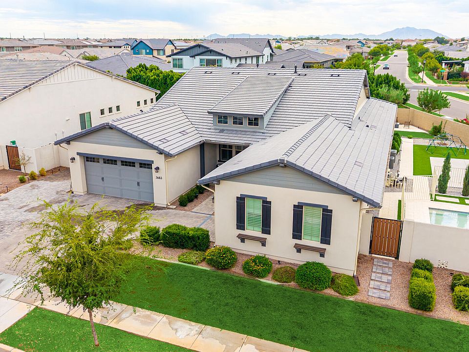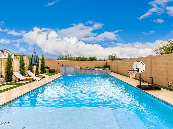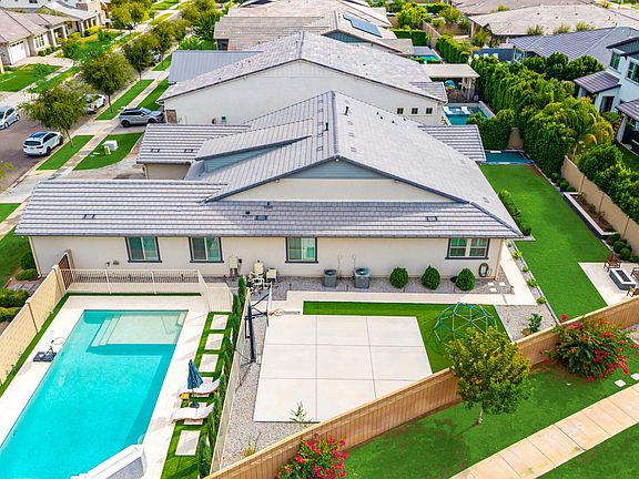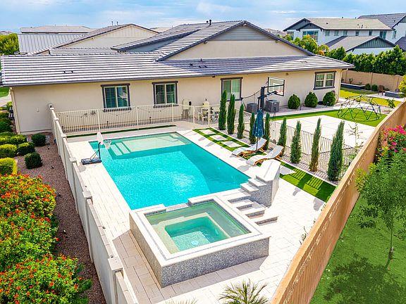 Indulge in the expansive luxury of this rare oversized corner lot, offering unmatched privacy, a large pool, sport court, and outdoor spaces made for entertaining. This single level home is located in the highly desired community of Lakeview Trails South at Morrison Ranch in Gilbert. While featuring 4 bedrooms plus a den/entertaining area, 3 full bathrooms and a premium N/S corner lot position this home is located just down the street from the pickleball and tennis courts, sand volleyball and the playground. The gourmet kitchen has an abundance of upgraded cabinetry, stainless steel appliances, Quartz countertops, 5 burner gas range, double wall ovens, large island with barstool seating, recessed lighting, pendants over the island, under cabinet lighting, pot filler, floating shelves, walk in pantry, stainless steel hood and chandelier over the dining table. Relax in this large primary suite complete with new soft carpet, beautiful double vanities, upgraded tile flooring in bathroom, separate tub and shower, and oversized walk in closet. For even more privacy, plantation shutters are on every window in the home. All the flooring throughout this split floor plan home has been upgraded to a stunning neutral luxury vinyl plank, modern tile and luxurious carpet. Just off of the family room, the den/ bonus room settles right there with it's upgraded glass french doors. Make a seamless transition from the indoor living space to the resort style backyard through upgraded large slider doors that open to the patio and backyard, ideal for entertaining or relaxing in your own private oasis! As you walk onto the travertine tile, you'll pass the built in rectangular trampoline, you'll see the large grass area with fire pit, play set, sport court, gated pool with oversized baja step, water feature, diving area, and hot tub. Top rated schools, close to shopping & restaurants and close to major freeways. Built in the final phase of the highly sought after master planned community, you'll enjoy driving through tree lined streets, seeing views of the lakes and silos, picturesque parks, extensive greenbelts biking and walking trails. This one WILL NOT LAST LONG!