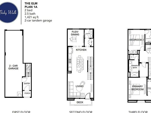 This floor plan offers a two car tandem garage and entryway on the first level. The second floor is your main living level and features an open kitchen with large eat-in island, a spacious living room, a flex/dining room and a large outdoor deck. On the upper level you'll find a conveniently located laundry room, your large primary suite with walk-in closet and a secondary bedroom with private en-suite bath.