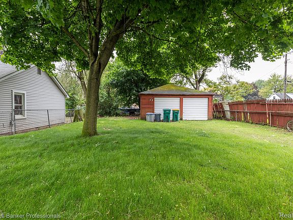 A large 2 car garage sits in the back of property with a fence surrounding the back yard.