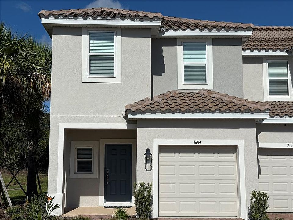 LUXURIOUS NEAR-NEW MARIGOLD MODEL TOWNHOME IN GATED BELLALAGO! Don’t miss this stunning, end-unit townhome featuring 3 bedrooms, 2.5 baths, and a 1-car garage, located in the highly desirable, resort-style Bellalago community. This beautifully maintained home offers an open-concept layout with high ceilings, elegant ceramic tile floors, and abundant natural light throughout. The modern kitchen boasts quartz countertops, a large center island, stainless steel appliances, and generous cabinet space—perfect for everyday living or entertaining. Sliding glass doors from the living and dining areas lead to a private patio with peaceful garden views, ideal for outdoor relaxation. Upstairs, you’ll find spacious bedrooms designed for comfort and style, along with a convenient in-home laundry area. HOA fees include free basic fiber internet and cable, as well as lawn care and exterior maintenance, allowing you to enjoy a low-maintenance lifestyle. Bellalago residents enjoy resort-style amenities including multiple pools, fitness centers, tennis and basketball courts, scenic walking trails, a fishing pier, boat dock, on-site dining, 24-hour security, and more. Surrounded by lush landscaping and natural beauty, this community is conveniently located near shopping, dining, schools, and the Poinciana Medical Center—just 5 miles away. Experience luxury, comfort, and convenience in this serene, park-like lakeside community!