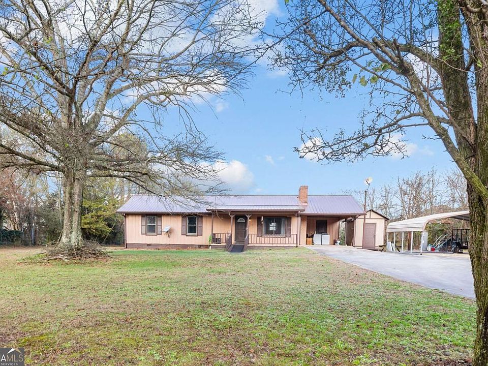 Rarely available ranch style 3 bedroom home on one full acre with NO HOA restrictions. Ideally located minutes from 400, close to Forsyth schools, and across from a popular county park, this unique property additionally offers covered parking for 3 vehicles with a storage building conveniently tucked between carports. The spacious level rear yard features a generous 2-story storage building plus another smaller storage building with attached carport. The recently refurbished interior of the home includes an all new kitchen with new modern cabinets and quartz counters, a farm-house style sink, new appliances including a refrigerator with french doors, and walk-in pantry, The kitchen additionally offers a large breakfast bar, generous dining area, and is open to the large living area with fireplace, A separate laundry room is conveniently located off the kitchen. The master bedroom features a large walk-in closet, and remodeled master bath with oversized subway tile shower and new vanity with quartz counters. The second bathroom has also been remodeled and features a tiled bath/shower and new vanity with quartz counter. Additional recent improvements include exterior and interior paint, laminate flooring throughout entire home, two year old gutters, windows, metal roof, and hot water heater.