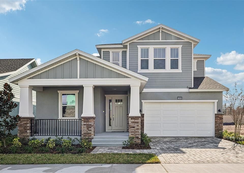 One or more photo(s) has been virtually staged. Spacious 2-Story Home with 2-Car Garage, Gourmet Kitchen & Flexible 4-Bedroom Layout Welcome to this beautifully designed Bromeliad plan, featuring a charming Craftsman-style exterior and a thoughtfully planned interior layout perfect for modern living. With up to 4 bedrooms and 3 full bathrooms, this spacious two-story home offers both comfort and functionality. Step onto the covered front porch and into a grand foyer, where you'll find a first-floor bedroom and full bath—ideal for guests or a home office. The open-concept main living area includes a gourmet kitchen with a large prep island, walk-in pantry, and seamless flow into the dining area and expansive family room—perfect for entertaining or relaxing. Enjoy outdoor living on the covered lanai, finished with elegant brick pavers that match the driveway for a cohesive look. Upstairs, the primary suite is a true retreat, featuring a spa-inspired en suite bathroom with dual vanities, a step-in shower, and a walk-in closet. Two additional bedrooms—one with a walk-in closet—a full bath, and a conveniently located upstairs laundry room complete the second floor. Don’t miss your opportunity to own this beautifully designed home with flexible living spaces and timeless style.
