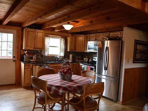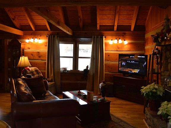 Rustic charm abounds in this 3BR/2BA log home with a mountain lodge feel. You will love the craftsmanship throughout. Rustic beam work soars above you in the living/Great room with a center stone fireplace and an open floor plan. The kitchen offers granite counter-tops, stainless steel appliances and a view of the back deck and level yard. A brick accent wall and floor-to-ceiling wood walls add to this property's appeal. The main level offers 2 bedrooms and a bathroom with 2 vanities and a tub/shower. The large upstairs loft/bonus room makes a great sitting/reading area or office with its built-in bookshelves. The master suite has a walk-in closet, sitting area and private en-suite bathroom. Relax on the covered front porch or on the back deck. An outbuilding offers additional storage space for lawn equipment, etc. Attached 2-car garage. Convenient location. A must see!