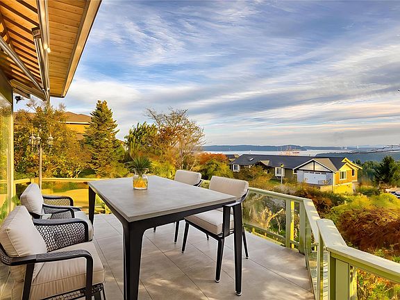 Welcome to 3688 Glen Oak Drive, where ocean, mountain, and city views unite in a stunning home, with a carriage house on site. The entry features a solid oak door with side windows, opening to a vaulted living room with a striking hanging light. The main level offers two family rooms, each with a fireplace, plus a bright dining area and kitchen with stone countertops, undermount sink, white cabinets, tile backsplash, stainless steel appliances, and an ocean-view eating nook. Step onto the large Ocean and City view patio with retractable awning overlooking Mount Benson, Nanaimo, and Gabriola/Newcastle Islands, or relax on the private rear patio. The main-floor primary bedroom includes a walk-in closet and ensuite, plus a powder room and laundry nearby. Upstairs are three bedrooms and two full baths. With breathtaking views, flexible layout, and main-level living, this home is truly exceptional. All measurements are approximate.