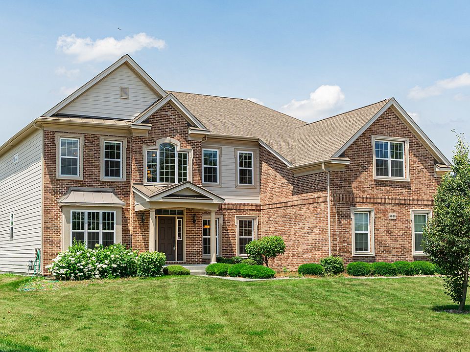 A gorgeous home loaded with exceptional trim details and upgrades! Enter through a stunning foyer with a curved staircase. The kitchen boasts beautiful granite countertops, a tile backsplash, upgraded stainless steel appliances, an expansive center island with seating, and an oversized pantry. The family room features an incredible floor-to-ceiling stone fireplace. The elegant dining and living rooms are brimming with exquisite trim details. The first floor proudly showcases gorgeous hardwood floors throughout. The elegant primary bedroom is a private retreat with a sitting area, an ultra-luxurious bath featuring an oversized shower, and a beautiful tile design. The primary bedroom also offers a sizable dressing area with a makeup table, granite counters, and three large walk-in closets, including two custom closets. This home also features spacious bedrooms, a basement with nine-foot ceilings perfect for finishing, and a rough-in for a bath provides abundant storage. The backyard paradise includes a brick paver patio, fire pit, and landscaped walls, backing to open space for elegant privacy. The side-load 3-car garage completes this beautiful home in a great location within a prestigious golf course community.