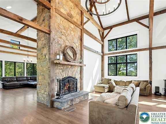 Bordering a serene park, Serendipity Acres encompasses 5.2 acres in the heart of coveted Saucon Valley. The dramatic 3-story 2018 barn home by Erwin Forrest Builders features an open floor plan punctuated by soaring ceilings & walls of windows framed in antique hand-hewn barn beams. The heart of the home is the masterfully crafted kitchen with a massive island, quartz counters, high-end appliances & walk-in pantry. A breathtaking stone floor-to-two-story-ceiling fireplace anchors the kitchen, dining & great rooms. The adjoining family room, w/vaulted beamed ceilings, hardwood floors, & walls of windows, provides both warmth & architectural drama. The primary suite occupies its own level with spa-inspired bath, enviable walk-in closet, & deck. 3 additional bedrooms & 3 baths will amply accommodate. Pointed stone walls & barn beams on the lower level attest to the home’s heritage, while a versatile multi-purpose room with garden access lends itself beautifully to a home theater, fitness studio, or creative space. Designed with multi-generational living & hospitality in mind, the carriage house features luxury finishes, including granite countertops & radiant heated floors. Garaging includes a heated 3-car garage & additional oversized garage with loft storage. Outdoors, the property features a 2020 saltwater pool, built-in ground-level trampoline, & expansive lawns. Smart home technology, ultra-efficient utilities, & maintenance-free Hardie plank siding ensure ease of living.