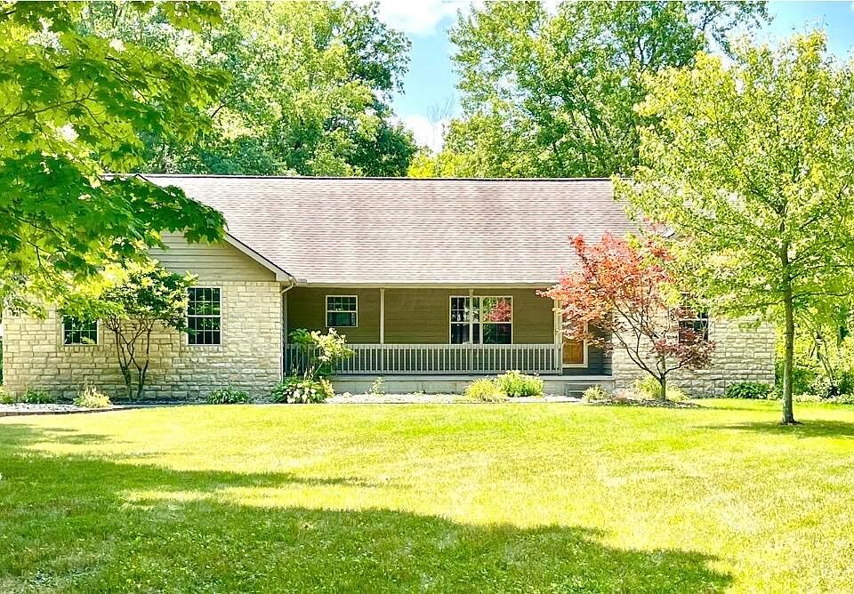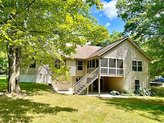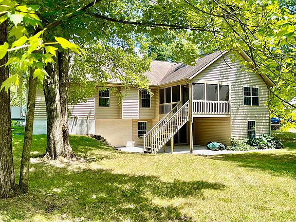 Large updated custom built ranch with open floor plan, full length covered front porch and 3 season sunroom, huge kitchen highlighted by pro series appliances and a large eat at peninsula that opens to the great room with cathedral ceiling, formal dining area and stone fireplace, just off the kitchen is a three season room overlooking acres of woods, large bedrooms, huge finished walk out lower level with bar/kitchen rough in and room for a pool table or and full bath.(both just beyond the furnished area. See pictures) The walkout lower level is flooded with natural light from two full length windows and sliding glass doors. Just outside of the walk out you will find a very large patio area both covered and uncovered. Property is updated and being sold as is as sellers unable to do more.