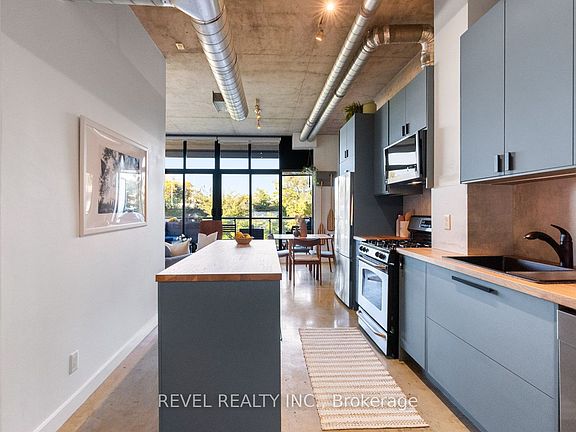 Welcome to Robert Watson Lofts where industrial charm meets modern comfort. This 2-bedroom, 1-bathroom loft blends character with convenience, offering polished concrete floors, soaring ceilings, and expansive windows that frame city views, including a glimpse of the CN Tower from the balcony. Inside, the open-concept living, dining, and kitchen areas create a seamless space to entertain and unwind. A new custom kitchen features sleek cabinetry, integrated lighting, a new fridge and hood range/microwave.The living area flows effortlessly, highlighting the airy design and unique loft details, featuring custom-designed Vitsoe 606 modular shelving that adds both style and function. Both bedrooms are thoughtfully designed with versatile layouts, wall-to-wall closets with customized built-ins and additional storage above, while the full bathroom offers contemporary finishes to match the modern loft aesthetic. The unit also includes a convenient building storage locker and parking. Enjoy the Robert Watson Lofts community amenities which include a well equipped gym, party room, and BBQ terrace on the 2nd floor, just across the hall from the unit. Step outside and enjoy Roncesvalles living at its best. Sorauren Park feels like your backyard, offering year-round community events, the weekly Sorauren Farmers Market, and green space right at your doorstep. The building itself is just steps from a major transit hub making commuting across the city whether by TTC, UP express, or GO transit a breeze. With easy access to High Park and the Waterfront, youre surrounded by boutique shops, cafes, breweries, and restaurants. this loft in Roncy places you at the centre of it all.