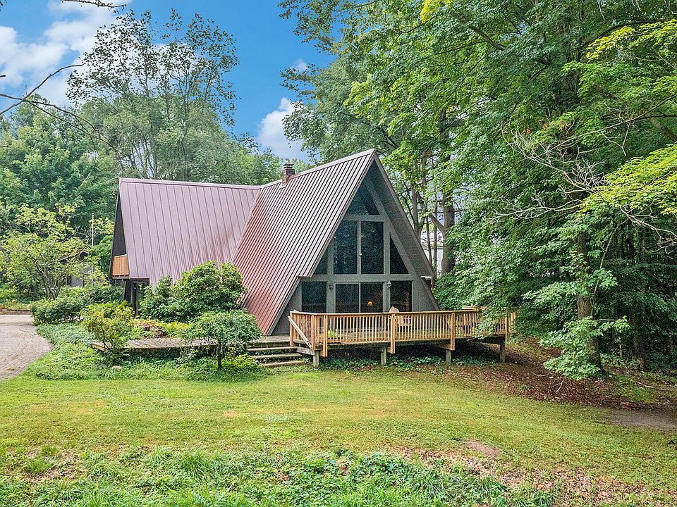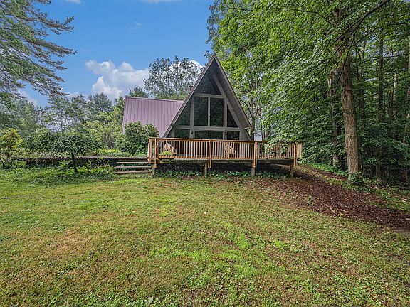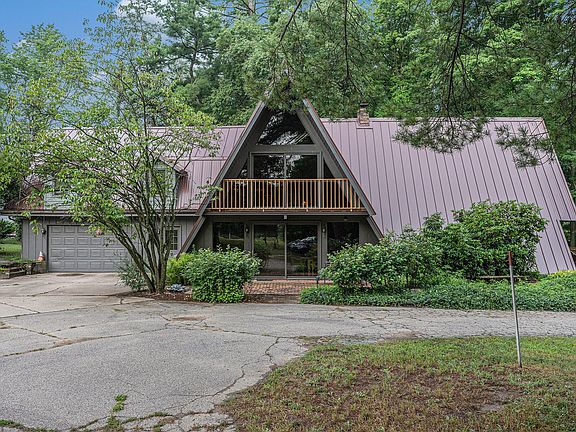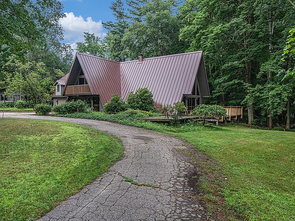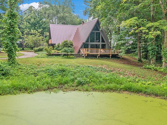This fabulous A-Frame Home is Nestled on almost 2 acres. Private, Wooded lot overlooking Private Pond. Soaring Stone fireplace in spacious family room walks out to deck overlooking pond, Formal Dining with sliders to Patio. Separate workshop features potential office or studio space with 1/2 bath, includes Utility/Storage space with overhead door. Pole Building has concrete floor and electric and 10' sliding door. Home Warranty included. Home is in process of New Hook-in to Municipal Water & Sewer. A verbal report from Environmental Inspection has been received and the Septic system has failed.