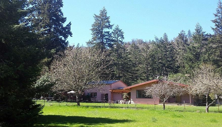 A lovely home on over 7 acres of land that includes select trees from a former tree farm, a large green lawn area, a newly constructed fenced garden area, and views of the nearby mountains. The furthest edge has a seasonal creek, with a few trails that lead you out and back from the main living area. The kitchen has been completely updated since March 2017, designed to entertain in a warm and contemporary look. Granite countertops, a large cook's island, an electric wall fireplace with stack stoned surround and mantle, and pendant lighting over a large farm table space. Newly installed French doors lead off the kitchen to a deck for entertaining. Two artist/office loft studios are attached to the garage reached by a breezeway from the main house.