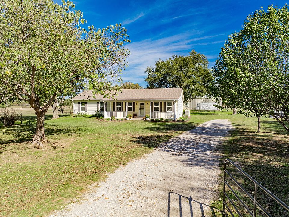 Looking for a relaxing place in the county to see the stars? Located near the LBJ Grasslands, travel paved county roads to find your new home nestled in the peaceful countryside with 20 + - acres covering both Wise and Montague Counties. This immaculate 3 bedroom, 2 bath home was beautifully restored in 2009 with a spacious primary suite added in 2013. The kitchen has electric stainless-steel appliances with the refrigerator included in the purchase of the property. The pantry contains added in-wall shelving to increase storage area. The primary suite features a bay window with storage, dual closets, dual sinks, a garden tub, a prep area, and direct access to a secluded back deck. Countertops throughout are granite and quartz. Closets, including coat and linen, are well designed to maximize storage capacity. The laundry room is spacious and filled with light. Located in the back yard shop is a charming and comfortably sized secondary living quarter that features a full bath, a kitchenette, and an overhead loft bedroom. Ideal for Airbnb rental or guest accommodations. Additional features include, a gated entry, reverse osmosis water filtration with water descale system and a storm cellar installed in the last 5-7 years. Bring your horses, cattle, and chickens to join the abundance of wildlife this property hosts. There are also 2 ponds on the property, one contains blue gill and large mouth bass. Outbuildings include a wood barn estimated at 20x30 with two stalls and a tack room, a doghouse that could serve as a chicken coop and the main shop estimated 34x40 with a 20x40 lean to. The main shop which houses the secondary living quarters also has a shop sink. Beautiful trees on this property also include apple, peach, plum, pear, oak, and pecan. Wild blackberries can also be found.