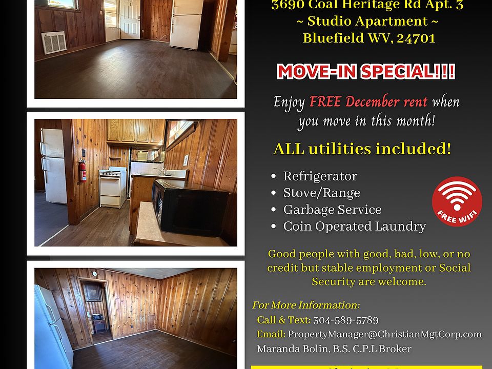 3690 Coal Heritage Rd Apt. 3 ~ Studio Apartment ~ Bluefield WV, 24701