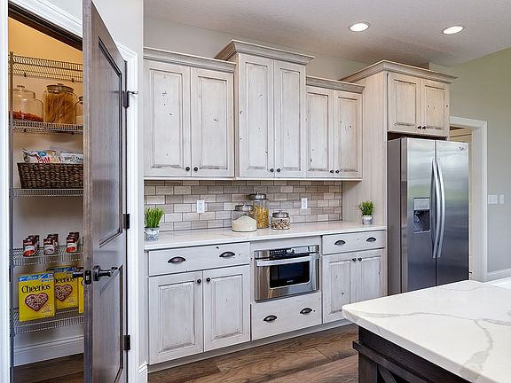 This 4-bedroom Aspen Homes Model features numerous unique touches and must-have amenities. But it's the wall-to-wall bookcase-flanked fireplace that will grab your eye. The focal point of the spacious open floor plan, it adds coziness and volumes of display space for collections. Overhead details also vie for attention, with a tray in the foyer, coffer in the great room, and french Country-style master bedroom ceiling adding sophisticated style and interest. Quartz kitchen counter tops, classic white farm sink, stainless-steel appliances, hardwood floors, pass-through master closet/laundry room with vintage sliding door-the list of desirables goes on and on. Builder's new model home is under construction.