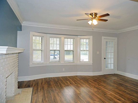 The living room has brand new flooring, a gorgeous decorative fireplace with built-in shelving on both sides, and a new ceiling fan/light.