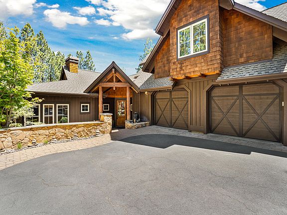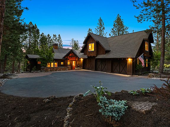 Experience an extraordinary fusion of NW contemporary and rustic lodge style in this stunningly and meticulously designed custom home, nestled among the pines overlooking Awbrey Glen's iconic 13th fairway. This home features soaring vaulted ceilings adorned with tasteful wood accents and exposed beams and a massive stone hearth with a wood-burning fireplace creating a dramatic and inviting atmosphere. The chef's kitchen is a culinary dream, equipped with a Wolf Range, double oven, granite countertops, and a large island, making it ideal for entertaining. Main level primary suite is a serene retreat, featuring a gas-burning fireplace and a luxurious master bath with double vanity and a beautifully tiled shower. A generous bonus room and two spacious bedrooms provide ample space for family and guests on the upper level. The peaceful outdoor living area includes a large wrap-around deck and a hot tub, perfect for relaxation. This exceptional property is a rare find and not to be missed.