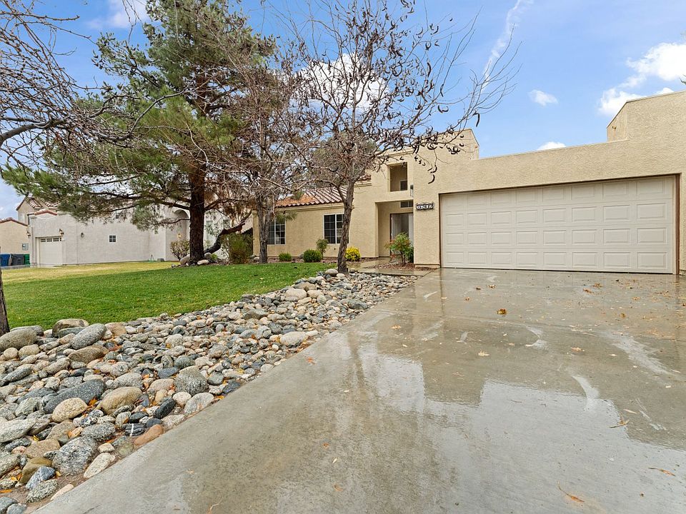 In the residential heart of Palmdale, sits a 1,410 sqft, 3-bedroom, 2-bathroom single family home, move in ready for the next buyer to settle and call this rare gem a home. A paved walkway, surrounded by a neatly manicured lawn and landscaping, leads to the front entrance of the home an upon entering through the double doors, you are greeted with a tile floored foyer that leads to a high ceiling living room. An open floor layout, with pale walnut toned laminate flooring throughout and a smooth flow to the kitchen. White cabinetry, built-in stainless-steel appliance and a breakfast bar are the finishes for this fully functionable kitchen. A lengthy hallway at the left of entry that has three bedrooms, all of which have carpet flooring and one of which is the primary with an en suit bathroom and walk-in-closet. Access from the living room/kitchen to a large backyard, with room to build a pool or to set up any sort entertainment attraction. Finally, home includes direct access from the kitchen to an attached 2 garage and has a washer/dryer hookup for the laundry.