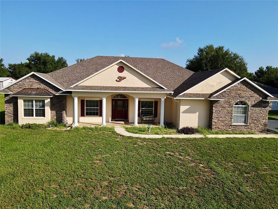 Custom-Built Lakeview Retreat on 5 Acres!    Discover the craftsmanship and charm of this custom-built 3-bedroom, 2-bathroom home, complete with an additional room ideal for an office or flex space. Situated on 5 scenic acres with breathtaking lake views, this property also includes two additional outbuildings.    In addition to the large two car garage, the detached garage is spacious 32x30 with a concrete floor and full electrical setup, making it perfect for a workshop, hobby space, or additional parking. The second outbuilding measures 24/25, with a concrete slab foundation and an 8-foot door—ideal for secure vehicle storage or extra workspace.    Inside the home, you’ll find an open floor plan with large bedrooms that seamlessly blends style and function. The kitchen features custom solid wood cabinetry, two large pantries, and a layout perfect for cooking and entertaining. The master suite is a private retreat, with a luxurious en suite bathroom that includes dual sinks, a garden tub, a separate shower, a linen closet, and a spacious walk-in closet. The two additional bedrooms share a bathroom with dual sinks, a walk-in shower, and a separate toilet area.  Bedrooms a split plan with a privacy door.   Second Master could be used a InLaw suite.       The kitchen also offers a bar area, a cozy breakfast nook, and a formal dining room, making it perfect for gatherings of any size. The home includes a large indoor laundry room with a washer and dryer included for added convenience. The large back porch is plumbed for a sink and has entrances from both the guest bathroom and master bedroom—perfect for a future pool area or outdoor kitchen.    This home is a showcase of custom craftsmanship, with numerous upgrades, ample storage, and thoughtful details throughout. It’s a must-see property that offers both luxury and comfort in a stunning setting.