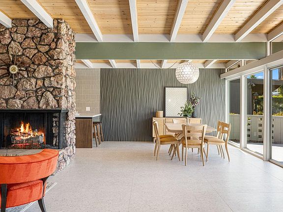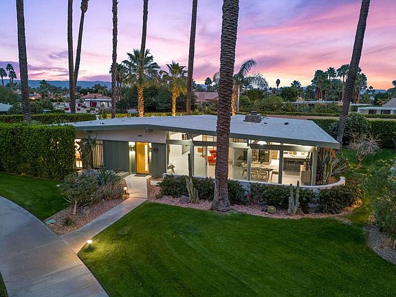 Fully renovated architectural gem, designed by William Krisel 1958, offers a rare opportunity to own a piece of mid-century history. 1 of 16 homes in Tamarisk Ranchos, Mills Act designation for its historic significance and tax benefits, this property seamlessly blends timeless design with contemporary updates.1/4-acre lot in the northeast corner of the community, the home boasts breathtaking west-facing views of the mountains.Featuring Krisel's signature A-frame design, the home has been reimagined with terrazzo-style flooring flowing seamlessly from the interior to the outdoor patio, reflects simplicity and elegance.The kitchen showcases custom walnut cabinetry, vibrant tile backsplash, and new high-end appliances; a perfect blend of vintage charm and modern convenience.Two large bedrooms with en-suite bathrooms completely remodeled, featuring mid-century-inspired tile, frameless glass showers, and luxury full-wall niches.Third bedroom, currently a media room, includes a custom entertainment center, dry bar, and vintage screen doors. This space features a full bath with tub, doubling as a powder room.Newly permitted laundry addition offers modern convenience while complementing the home's timeless appeal.Grand courtyard is paradise, surrounded by mature landscaping and evening lighting. Outdoor space complements the home's restored identity. Quiet community heated pool and spa in the central garden with amazing views.New electrical panel and wiring, plumbing, kitchen, all 3 bathrooms, flooring, cabinets, driveway, pavers.... the list goes on and on. Own a piece of iconic mid century history