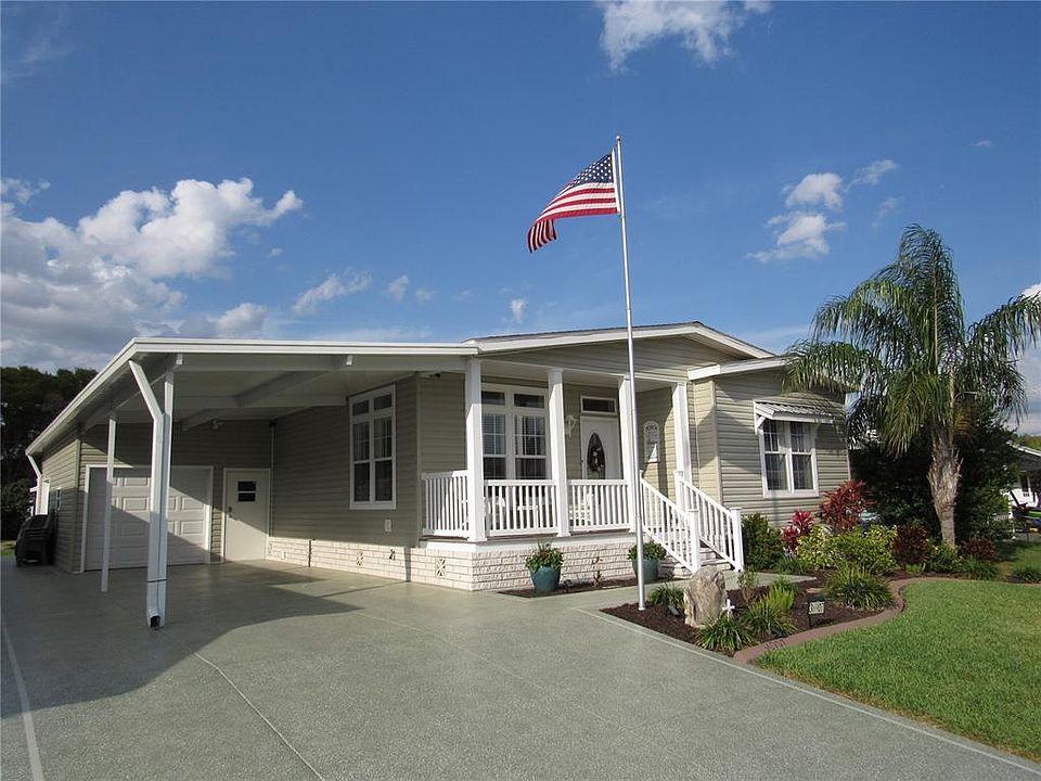 Seller motivated and entertaining all offers for this Like new & move-in-ready 2021 Jacobsen. This luxurious home features 2"x6" frame walls, all drywall interior, 9' ceilings with crown molding, transom style windows in the living room and dining room, 3 bedrooms with split floorplan, 2 full bathrooms, laminate flooring in all main living areas, 1764 square feet of heated and cooled living space + attached 1 car garage (14'x30') constructed totally of 3.5" insulated wall & roof panels with electric door opener & separate roll up door for golf cart parking, (Golf cart & charger included with sale) steel shelving units & work bench. Spacious open floor plan with large chef's kitchen featuring; built-in desk area, glass tile back splash, undermount cabinet lighting, stainless steel appliances including side-by side refrigerator, glass top electric range with European style range hood, dishwasher, built-in microwave, (Extended transferrable warranty until February 2027 for all major kitchen appliances), breakfast bar with seating & farm style stainless steel sink with disposal, beautiful countertops, and plenty of cabinet space. Nice sized dining area with tavern height expandable table & 6 chairs, Living room with decorative tray ceiling & modern style 6' ceiling fan, laminate flooring, large L shaped sectional sofa with 3 power reclining sections & decorative throw pillows for added comfort, swivel chair, wall mounted 70 inch LG. smart TV, 8'x10' area rug to anchor the seating area, matching coffee table and end table with lamp, floor lamp for additional lighting, accent wall with Audio/video cabinet, 2 glass door bookcases for displaying art or personal items & blinds for privacy and light control. Front bedroom/den features laminate flooring, sofa with Queen sized hide-a-bed, recliner, TV cabinet with wall mounted tv bracket, glass top end table with lamp, area rug & a large full-size closet. Dedicated laundry room with tile floor, LG washer/dryer, upper storage cabinets & built-in laundry sink. Hall bathroom with tile floor, 5' tile shower with low step entry, large single vanity, vent fan, transom window & mirrored medicine cabinet. Spacious carpeted second bedroom with matching bedroom set including queen size bed with headboard/footboard, dresser with mirror, nightstand with lamp, ceiling fan & large full-sized closet. The carpeted master suite includes a walk-in closet with built-in shoe rack, matching bedroom set with King sized bed frame, 2 nightstands with lamps, dresser with mirror, chest of drawers, side chair, ceiling fan and a stunning in-suite bathroom with tile floor, dual sink vanity, large mirror, HUGE 8' tiled shower with dual controls, bench seat & linen closet. Exterior features include a welcoming covered front porch entry, perfect for enjoying the outdoors, professionally landscaped front yard with irrigation, 3 security cameras, custom painted driveway (coated 2/22/24), vinyl lap siding brick skirting & a nice location close to park amenities. This Jacobsen home is a must-see! furnished including all major appliances. Located in Betmar Acres. An active and friendly 55+ community where you own your land. This home is a wonderful option for living the active Florida lifestyle you desire. Betmar offers lots to do to keep you busy whether it's playing Bingo or shuffleboard, going for a swim in the pools, relaxing in the parks 2 hot tubs, enjoying a round of golf, or playing pickleball this community has you covered.