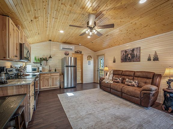 Currently featured in a short-term rental , the cozy cabin features an inviting open living area with a gas fireplace, well-equipped kitchen, one private bedroom, built-in bunks, and a sleeper sofa — comfortably accommodating guests for a peaceful getaway. Step outside to enjoy the breathtaking brow views from the covered dining area or unwind in the hot tub surrounded by mountain serenity. A separate storage building provides convenient laundry facilities and extra storage space, adding practicality and function to this beautiful setting.