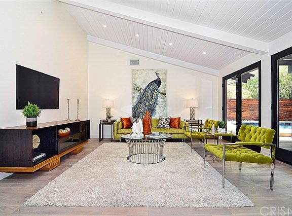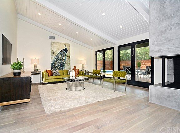 Finally, a proper renovation of a vintage Mid Century Modern home. This is not lipstick on a pig, rather a carefully crafted restoration featuring wood beamed ceilings, hardwood flooring, and high end fixtures throughout. The floorpan is ideal for today's modern family. Three bedrooms on the west side of the home including a generous master suite with ensuite bath and egress to the rear yard/pool and one bedroom on the east side with a private bath. Interior highlights include an open concept kitchen with white oak cabinets, quartz counters and high end fixtures, formal living room with vaulted ceilings and sliders to the pool, as well as a cozy family room for TV and gaming. OMG, the back yard is just plain jaw dropping with custom wood work throughout, recently redone pool, fire-pit and PRIVACY! Not too big, not too small--just right!