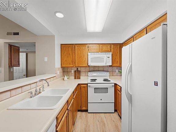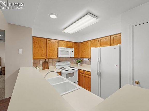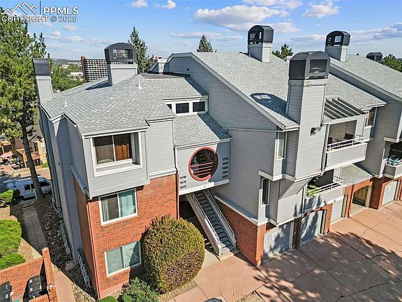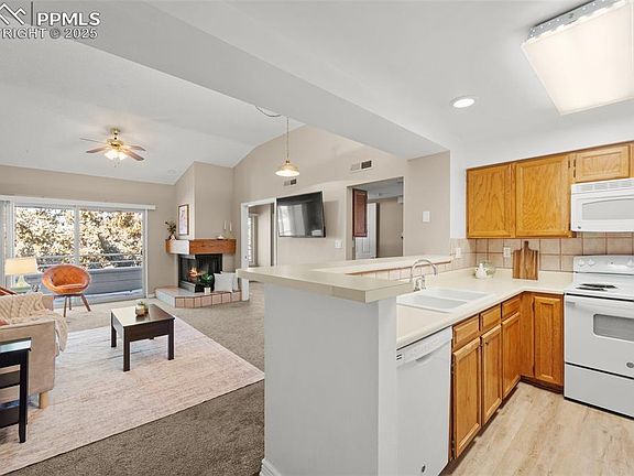 Welcome to this delightful 2-bedroom, 1-bathroom condo with a 1-car garage, offering a perfect blend of comfort and style. Step inside to discover an inviting open-concept living space bathed in natural light, featuring vaulted ceilings. The kitchen boasts a breakfast bar and great sight lines into the living room. A cozy fireplace sets the perfect ambiance for relaxation, situated next to double sliding glass doors that lead to a private deck with views of Cheyenne Mountain. The deck also features a private lockable storage closet, great for storing Christmas decor, potting materials for plants, or whatever you desire. Inside, you'll find two generously sized bedrooms with ample closet space. The ¾ bathroom has been tastefully upgraded, showcasing a double vanity and a stunning freestanding shower. Additional features include in-unit laundry with cabinet space for extra linens and detergent and an attached ground-level garage. Perfectly placed for convenience, this condo puts you right in the heart of the city. You'll love being a few minutes away from shops, restaurants, and easy access to Academy Blvd. Don't miss out on this great opportunity!