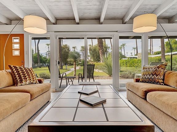 Lovingly maintained by the same family for many years, the home has been thoughtfully updated while preserving its original architectural integrity. The spacious living room features open-beamed ceilings and floor-to-ceiling walls of glass, framing breathtaking views of the lush central courtyard, mature landscaping, and the San Jacinto Mountains beyond.