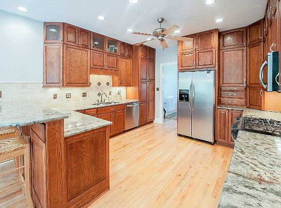 Beautiful brick 4 or 5 bedroom 2.5 bath home with side entry 2 car garage! Beautiful wood floors! Kitchen with granite counter tops, tumbled stone backsplash, updated cabinets, awesome faucet & under mount sink, built in pantry with fold out shelving, lazy susan, gas stove, built in microwave & frig negotiable! Breakfast room with bay window! Open floor plan to living room with wood burning fireplace, wainscoting, built-ins plus nearby work niche! Dining room with wainscoting! Office with french doors! Owners suite with tray ceiling, 2 closets (1 walk in), double sink granite vanity, nice shower with glass door & jetted tub! Good size spare bedrooms! Guest bath totally updated with double sink vanity! 5th bedroom or bonus room with built ins & bench seat! Lg laundry room with ceramic tile floor, storage cabinets & room for frig! 2 tier deck with pergola overlooking fabulous backyard!