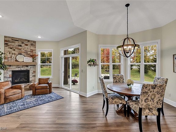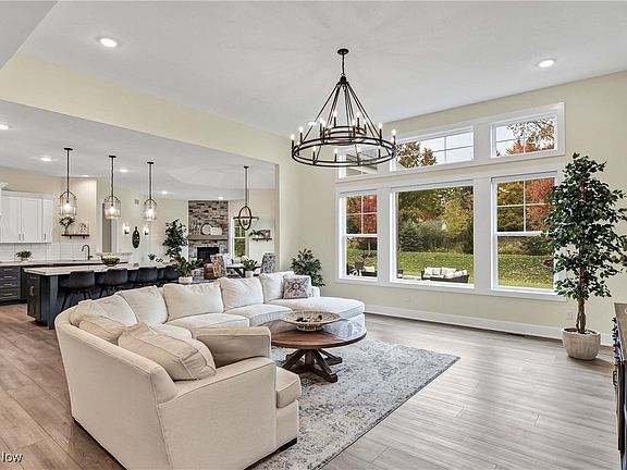 Prepare to be moved! Welcome to this stunning modern craftsman-style ranch, offering 4 bedrooms, 2.5 bathrooms, and 2,804 sq. ft. of thoughtfully designed living space. Nestled on a beautifully landscaped lot with mature trees, this home combines elegance, comfort, and functionality in a serene setting. Step inside the inviting entryway, where natural light and open-concept living define the home’s design. To the left, elegant glass French doors lead to a private office perfect for working from home or enjoying quiet reading time. The expansive great room is bathed in natural light through a wall of windows complete with custom built in blinds, The open flow leads into a gourmet kitchen featuring a two-tone design with navy lower cabinets and crisp white uppers, 2 inch thick quartz counter tops, a stunning waterfall island with breakfast bar seating, tile backsplash, black stainless steel appliances, and designer lighting ideal for both everyday living and entertaining. Adjacent to the kitchen, the dining area is surrounded by large windows that fill the space with sunlight. A modern chandelier adds warmth and charm, creating the perfect ambiance for family meals or gatherings with friends. The spacious primary suite offers a private retreat, complete with large windows, a full ensuite bathroom featuring a walk-in shower, and a generous walk-in closet. Three additional bedrooms and a stylish half bath provide ample space for family and guests. The spacious basement offers endless possibilities ready to be customized into a home theater, gym, or recreation area. Located in a desirable neighborhood, this home offers easy access to major highways for convenient commutes to both Cleveland and Akron. Close to schools, shopping, and dining, and bordered by the scenic Cleveland Metroparks, residents can enjoy both comfort and connection to nature. Don’t miss this exceptional North Royalton ranch custom built by Petros.