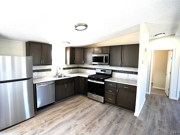 **I welcome you to see this Stunning ground-set Double-Wide Manufactured Home** Completely Remodeled from Roofing(INSTALLED MAY 2024) to Flooring, nothing has been spared here** Located in one of the most desirable areas in Golden Valley Arizona **Nestled on a spacious 1.18-acre lot with easy access, this property offers a perfect blend of modern amenities and serene living. A Big Plus on Town Valley Pioneer Water Supply, no hauling water on this one** Every inch of this home has been meticulously updated & Remodeled*upon arriving & noticing the new roofing*trimmed widows* exterior completely painted* new doors, new concrete at entryways** Step inside & see this move-in ready beauty* the heart of the home is the kitchen, boasting all-new cabinetry* state-of-the-art appliances, new exhaust vent hood, making it a chef s dream* The bathrooms have been completely transformed, new faucets, toilets, and a luxurious tiled walk-in shower in the master bath, and new vanities, providing a spa-like retreat. Comfort extends throughout with new carpet in living areas and fresh interior paint giving the entire home a bright, welcoming atmosphere. Highlights of UPGRADES include CENTRAL HEAT & AIR (INSTALLED FEB 2024), NEW SEPTIC SYSTEM, RV HOOKUPS, ALL NEW WATER LINES & NEW ROBUST 200-AMP ELECTRIC SERVICE PANEL, sleek new vinyl & carpet flooring & New hot water heater, ensuring ample hot water for all your needs. All installed to offer hassle-free living. Words can't fully capture the beauty and quality of this home. Experience why this property is the epitome of modern living in a prime location