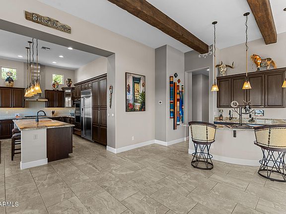 Chefs dream kitchen featuring granite countertops, gas cook top, double ovens pantry and options for both formal and casual dining. Extras include, updated AC Custom Electric blinds and plantation shutters. 2 car garage and bonus Golf Cart garage/workout room. View this home in one of Arizonas most desirable master-planned communities.
