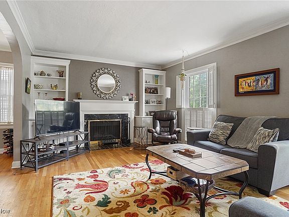 Beautiful Shaker Hts Brick Colonial with finished third floor and basement was hardwood floors that run throughout the top three floors. Oversized Living Room is accented with Crown Molding, bookcases the frame the gas Fireplace with decorative mantel and tiled hearth and windows with plantation shutters. The living room is an inviting space off the entry and opens to the formal dining room through archways. The dining room features a built in cabinet and double doors leading to the stone patio and lovely backyard. Bright Eat in Kitchen boasts wood ceiling, dining nook, pantry, appliances, recessed lights and plenty of counter spaces. Don't miss the half bathroom conveniently located near the side entrance. The second floor has a spacious primary bedroom with large closet and two additional bedrooms. One bedroom has a walk in closet that also leads to the back balcony area lined with rails overlooking the backyard. Full bathroom has tiled floor and partial walls plus granite vanity top. Third floor is a welcome bonus with another bedroom with generous closet spaces and a bonus area perfect for a home office or private lounge area. Finished basement offers additional living space with built in bookcase and tiled floor. Additional living space perfect for a recreation room, workout room and even a playroom. The other half of the basement has the laundry area with sink, washer and dryer plus plenty of storage areas. The backyard does not disappoint with landscaping, patio, partial privacy fencing and garage which is located towards the back of the yard to allow for a nice yard space. Neutral decor throughout the home with trim work and doors painted white. Many areas has crown molding accents and windows with plantation shutters. Tons of natural light and open hallways, this gem feels so welcoming. Located close to Van Aken District, sidewalks, shopping, restaurants, more. POS Compliant! New Boiler 2025