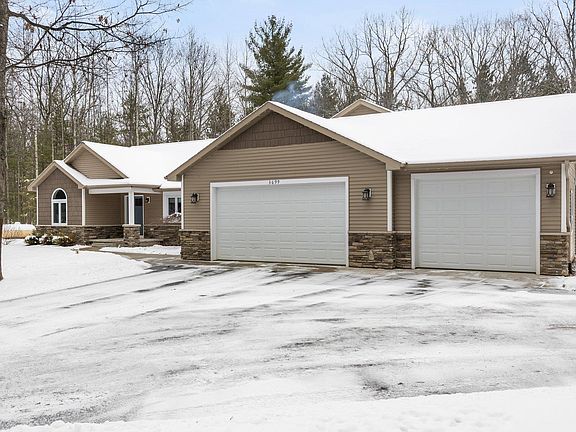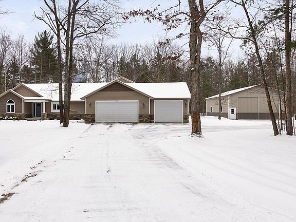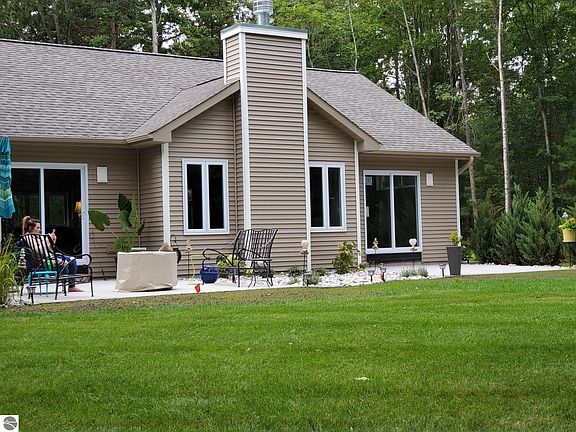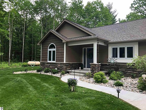 Welcome to your perfect woodland retreat! Discover this stunning home nestled on 2.57 acres of wooded privacy, just 10 minutes from downtown Traverse City. The open floor plan welcomes you with cathedral ceilings and a modern island kitchen that’s perfect for gathering. The main level features brand-new windows, flooding the space with natural light. This thoughtfully designed home offers five bedrooms, three of which include ensuite bathrooms, and 2 of which have custom closets to maximize storage and style. Stay comfortable year-round with a heat pump, a stone fireplace, air conditioning, and a heated 3-car garage with epoxy flooring. The 32x48 pole barn, with a 14 ft door, provides ample room for your projects or toys, while the sprinkler system keeps your outdoor spaces vibrant and inviting. Located on a county road (privately maintained), this home blends modern living with the peace and quiet of nature—all just a short drive from everything Traverse City has to offer.