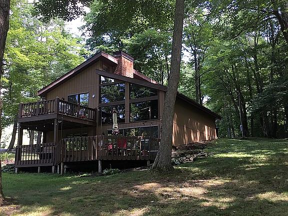 Private Setting on 5.690 Acres. Open Concept Living Room with Cathedral Ceiling and Skylights. Large Stone Fireplace with wood burner. 2 large wooden decks. Many updates. Newer Roof in 2009. Newer Siding on Garage and Newer Garage Doors with Openers.