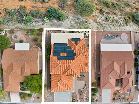 Sundance located on an Elevated Lot with Owned Solar & Mountain Views! Front Courtyard leads to Entry Gate. Freshly Painted Interior & New Carpet 11/2025! Living Room with Gas Fireplace & Dining Room with Mountain Views. Great Room with Views. Kitchen with Solid Counters, Corian Top Island, New Refrigerator, 42'' Cabinets with slide-outs, Pantry, Desk & Dining Area with Patio Slider. Den has French Doors. Powder Room. Owner's Suite with Mountain Views. Owner's Bathroom has Walk-in Shower, Safe Step Tub, & 2 Walk-in Closets. Laundry Room with W/D, Sink, & Cabinets. Upstairs 2 Bedrooms have 2 Closets with Jack & Jill Bathroom. Extended 3 Car Garage has 2017 HVAC's, 2023 W/H & Cabinets. Covered Patio with extended Pavers, BBQ, Firepit, Water Feature, Fruit Trees, Gated Yard & Mountain Views!