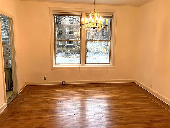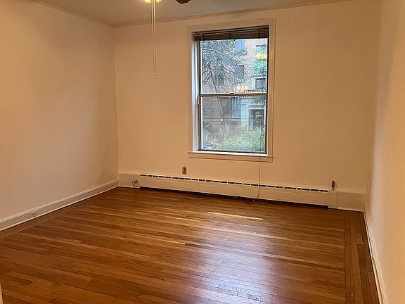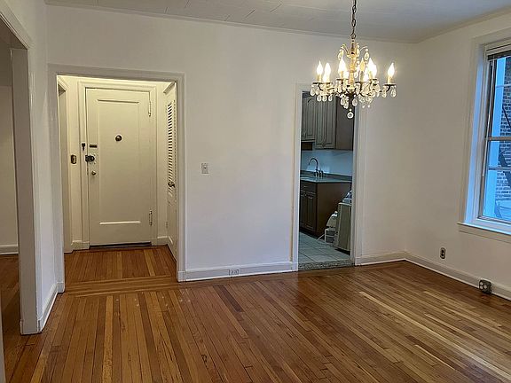 This four-room apartment at Linden Court has large windows facing both east and west for sunlight all day long. Located on the raised first floor, the living room is open to the dining room, with both rooms spanning the full depth of the apartment. The renovated kitchen, adjacent to the dining room, has its own closet and large window. The bedroom and bath are located just beyond the dining room. In addition to the bedroom closet there are two pairs of closets at both the entry and the hall between the bedroom and bathroom. Wonderful prewar details remain, including oak strip floors, 9’ ceilings, and moldings. This is a walkup building.