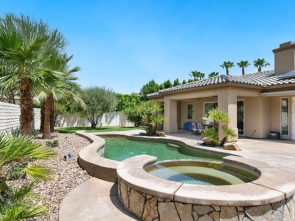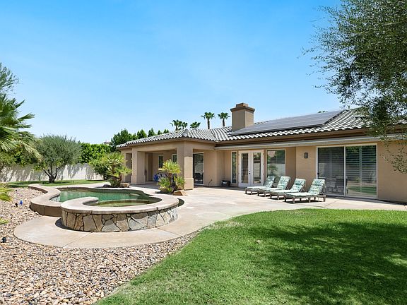 This nearly 3700 square foot resort-style home is located on a flag lot at the end of a super quiet cul-de-sac in a prestigious gated community in the center of Rancho Mirage, "The playground of Presidents." Complete privacy is assured as the property is surrounded by large trees and 8 ft walls while there is virtually no vehicle traffic nearby. Exquisitely decorated in 2021 with all new furniture, appliances, TVs and super quiet high efficiency air conditioning, this home offers resort style amenities on a half acre of land, providing you unparalleled privacy.