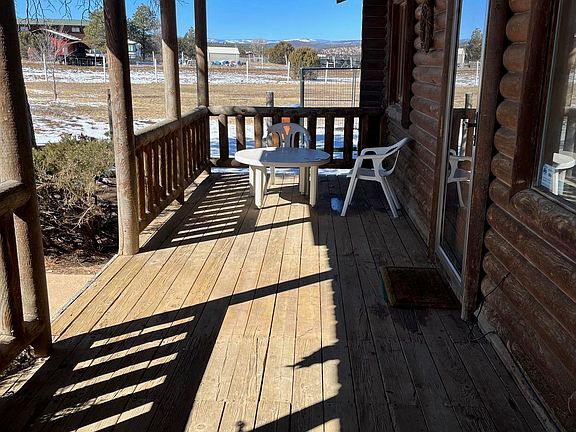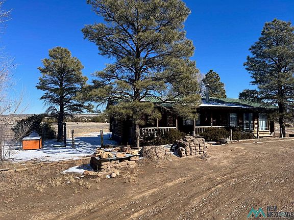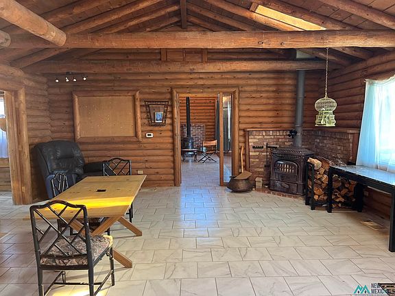 Charming Log cabin on 8+acres located just 2.5 miles from Las Vegas. This home with great southern exposure features a large covered front porch, a spacious living room/dining room with wood burning stove, beautiful tile flooring, huge main bedroom with floor to ceiling windows and wood burning stove, galley kitchen with plenty of cabinets, appliances, 2 additional bedrooms, one with access to the open deck providing views of the land which is fenced at the west, east and north boundaries. A well, septic, propane, and power service this property. Extras include an on demand water heater, central heating and cooling, RV hookups, and large dog kennel/doghouse. Renovations in 2020 include the kitchen, HE propane furnace, insulated ducts and central AC, HE on-demand hot water heater, 200 amp electric, ceramic tile floors, and back deck. This home is move in ready!
