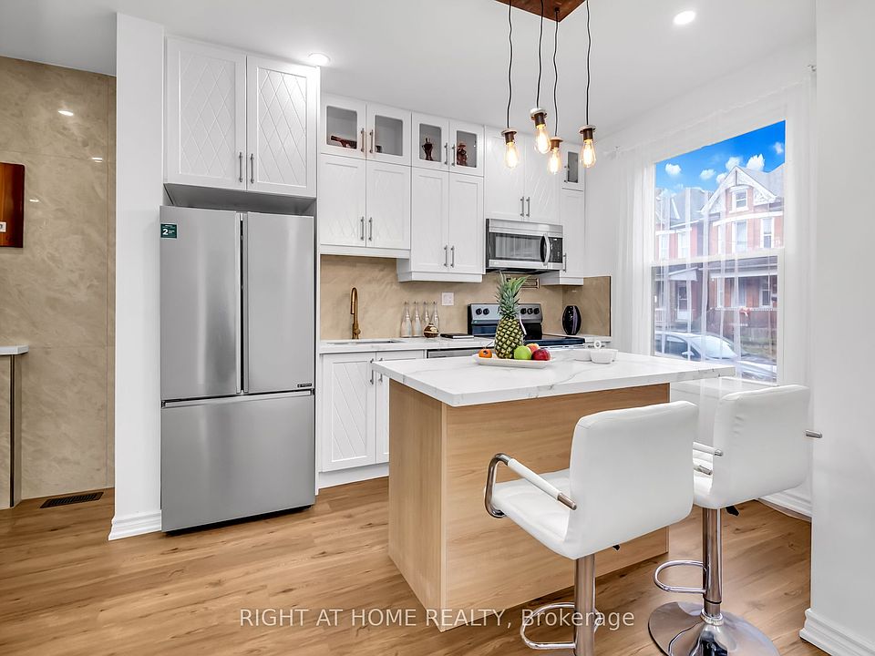 Move in and enjoy this brick home in the heart of a family-friendly neighbourhood in Hamilton. Fully renovated by an experienced team. Welcome to the open concept on the main floor with a tiled focal media wall with a 50-inch fireplace with abundant natural light, offering joy and relaxation for the whole family. Brand new modern kitchen/quartz counter and island with all soft-close doors and drawers in all fine cabinetry/top display cabinet with interior lights/under cabinet lights spice cabinets/two-compartment pull-out garbage bin/above stove pot filler/tiled backsplash. LED pot lights throughout the house, entrance closet, and 2-piece powder room on the main floor. Large Master bedroom complemented by an ensuite feature walk-in closet with custom storage, feature wall, ensuite luxury bathroom with glass enclosed shower with rainfall shower panel, linear drain, double sink vanity with quartz counter, LED mirror and HEATED floor. The 2nd bathroom has a high-profile soaker tub with a fall shower head and medicine mirror cabinets. Private backyard ideal for BBQs, pets or garden retreat. The basement is ready to be transformed into a rec room, gym or office. A blank canvas to add living space and future value!