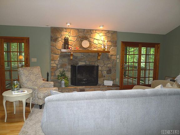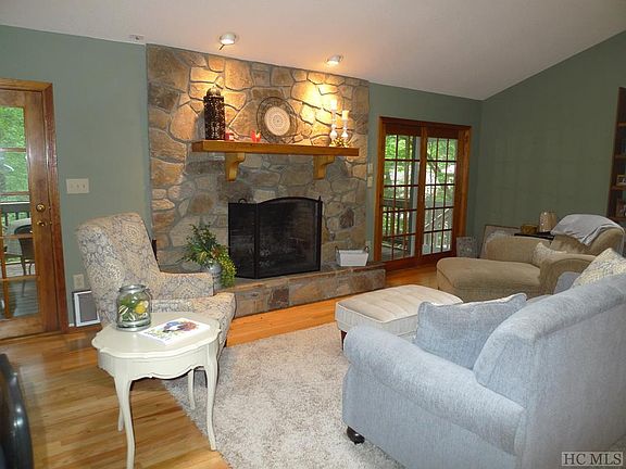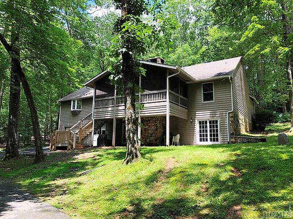 Lots of living space in this three bedroom, three bath home which features living room, dining room, family room downstairs, separate laundry room. Living Room with hardwood floors and skylights which opens up to huge screened porch with vaulted ceilings. Formal dining room. Eat-in kitchen off dining room, with stainless steel appliances, gas stove. Master bedroom suite on main level. Master bath with tiled shower, separate tub, double sinks. Two guest bedrooms/bath on main floor. Family Room on lower level with second fireplace, wet bar. Family Room opens up to large patio area. Office/hobby room located downstairs. Lots of storage downstairs. Double-car garage with extra space for workshop area off family room. Children's playhouse on property could use work. Ideal corner lot with easement directly behind home that you could walk to the Horsepasture River, overgrown at this time. Lot is .75 acres and is pretty level with a great yard too! Circular paved driveway in front for entry, along with paved driveway in back for entry to garage. Owners built home; purchased property in 1986. Total fees above include 2021 Sapphire Valley Master Association of $858 for the amenities; Holly Forest HOA of $715 for the roads. 24-hour roving security.