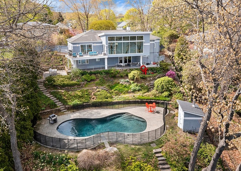 Lakefront, furnished contemporary home with designer finishes minutes from Cambridge, Boston, and I-93. This unique Arlington residence, with sweeping water views from two levels, is set high on a landscaped hillside and offers picturesque outdoor entertaining spaces, a heated pool, hot tub, lush garden areas, and direct lake access for a true resort lifestyle. Inside, a dramatic panoramic wall of glass elevates the main level, blurring the line between indoors and out. In this open concept floor plan you will find a beautifully appointed chef's kitchen, living and dining areas, sunroom, breakfast nook, and a modern primary suite that opens to the deck. The secondary level offers two additional bedrooms, a full bath, and a spacious bonus room ideal as a family room, office, or guest suite. Crafted for everyday living, entertaining, and relaxation, this rare retreat seamlessly blends lakeside serenity with metropolitan sophistication an unparalleled opportunity at the edge of Boston.