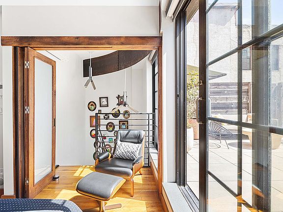 This home blends historic character with a modern design. Floor-to-ceiling windows and sliding glass doors connect both levels to private outdoor spaces: a balcony off the living room and a secluded terrace upstairs with a retractable awning. The modern kitchen features a Bertazzoni range, Caesarstone counters, and bar seating that's perfect for entertaining.